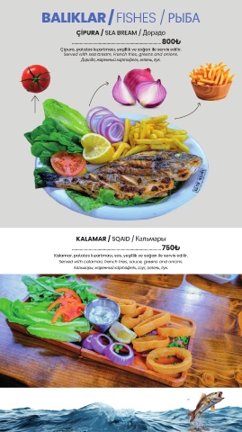 Çipura, patates kızartması, yeşillik ve soğan ile servis edilir.