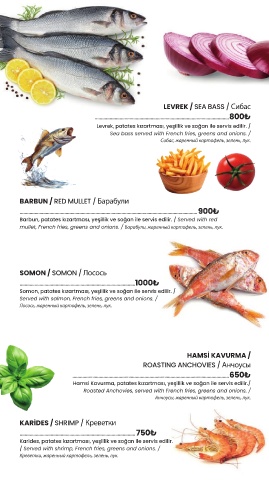 Barbun, patates kızartması, yeşillik ve soğan ile servis edilir. / Served with red